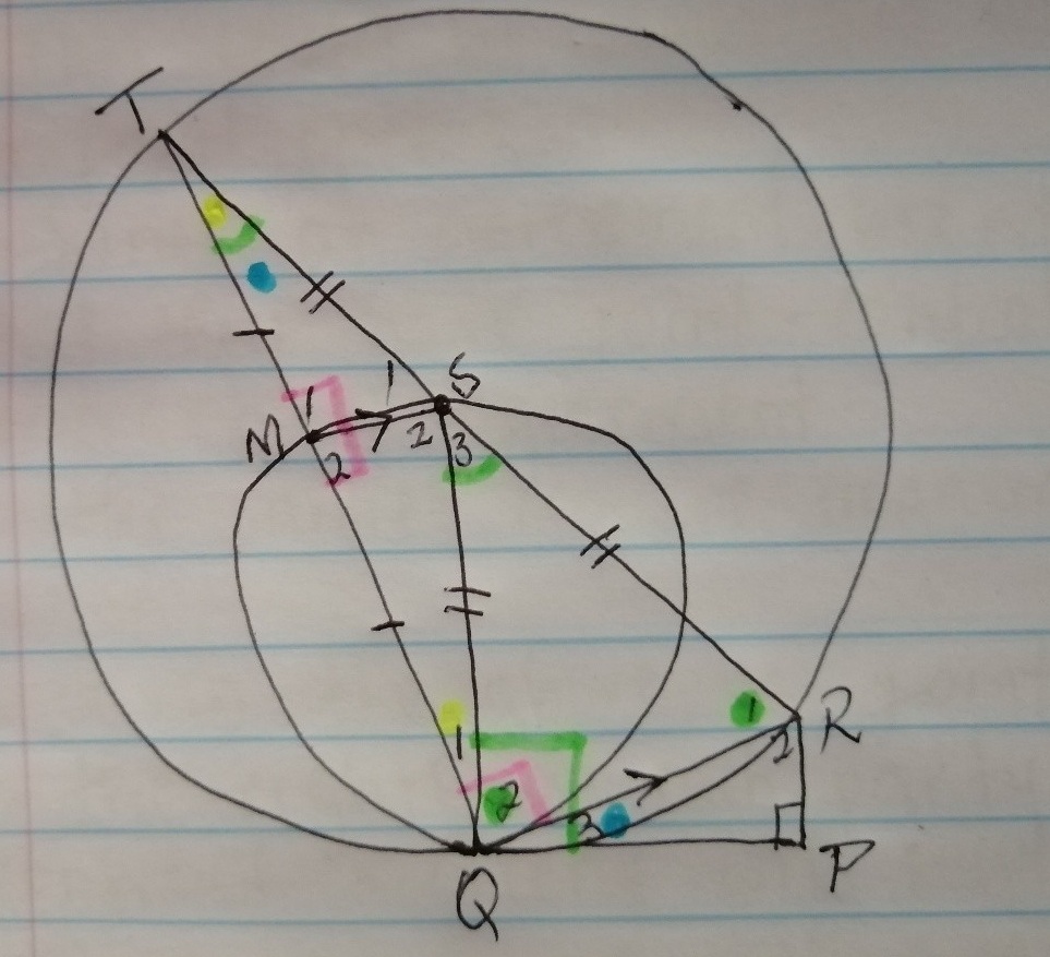 - TS, SR, QS are radii creating isosceles triangle TSQ and SQR